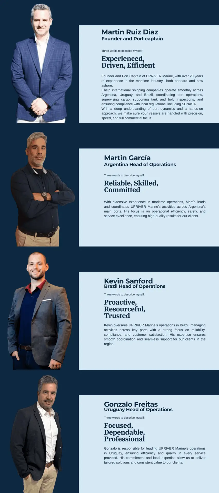 Up River Marine exists to ensure that every vessel operation—whether on a bulk carrier or a tanker—is carried out safely, efficiently, and with maximum commercial value, across Argentina, Brazil, and Uruguay.